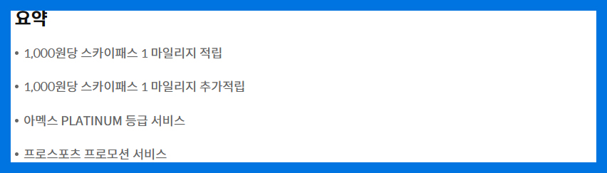 | 요약 -국내외 가맹점 1마일리지 기본적립 -특정 업종별 1,000원당 2마일리지 적립(기본 1마일리지 + 추가 1마일리지) 직판 항공권 / 기내 면세점 2마일리지 적립 해외 가맹정 / 국내 면세점 2마일리지 적립 -웰컴 보너스 3,000마일리지 적립 |