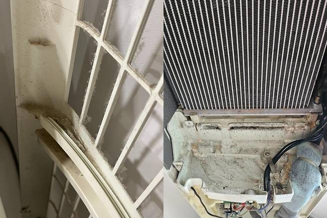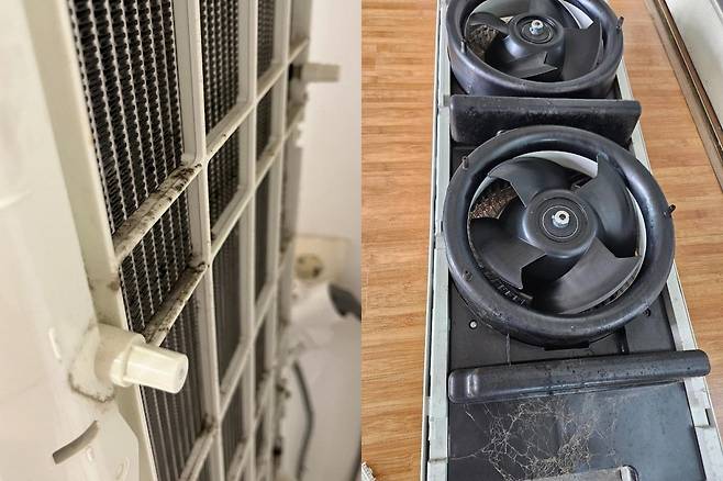 -에어컨에 들어 있는 먼지가 차가운 바람을 맞아 물기가 생기면서 각종 세균으로 번식되면서 곰팡이가 됩니다. 곰팡이는 호흡질환에 문제를 일으키며 특히 아이들에게는 치명적인 세균으로 인해 위험하실 수 있습니다.